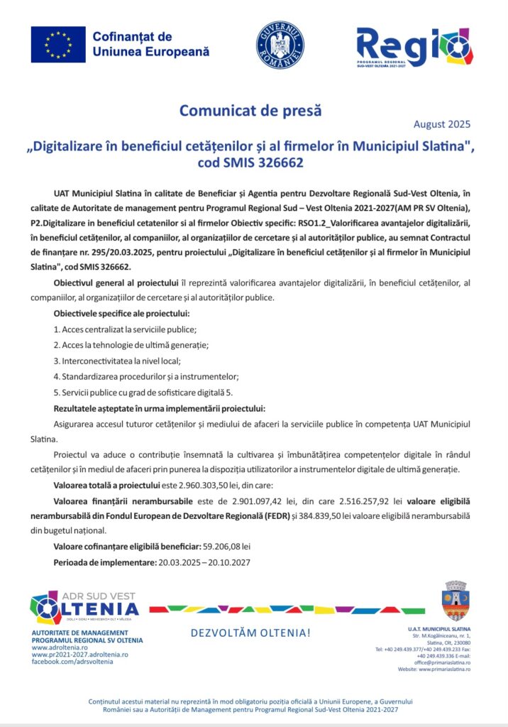 ActualitateComunicat de presă August 2025 „Digitalizare în beneficiul cetățenilor și al firmelor în Municipiul Slatina”