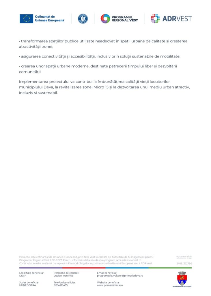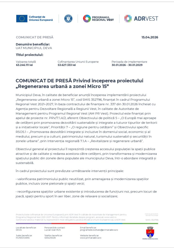 COMUNICAT DE PRESĂ Privind începerea proiectului „Regenerarea urbană a zonei Micro 15″