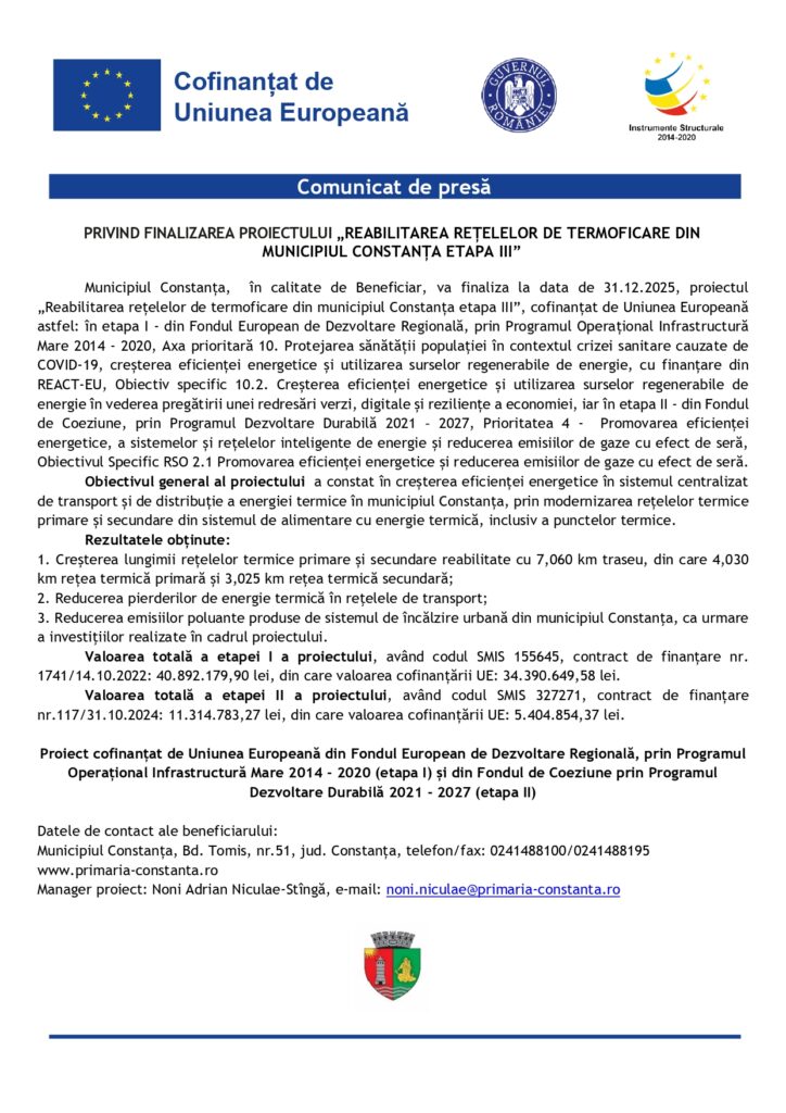 COMUNICAT PRIVIND FINALIZAREA PROIECTULUI „REABILITAREA REȚELELOR DE TERMOFICARE DIN MUNICIPIUL CONSTANȚA ETAPA III”