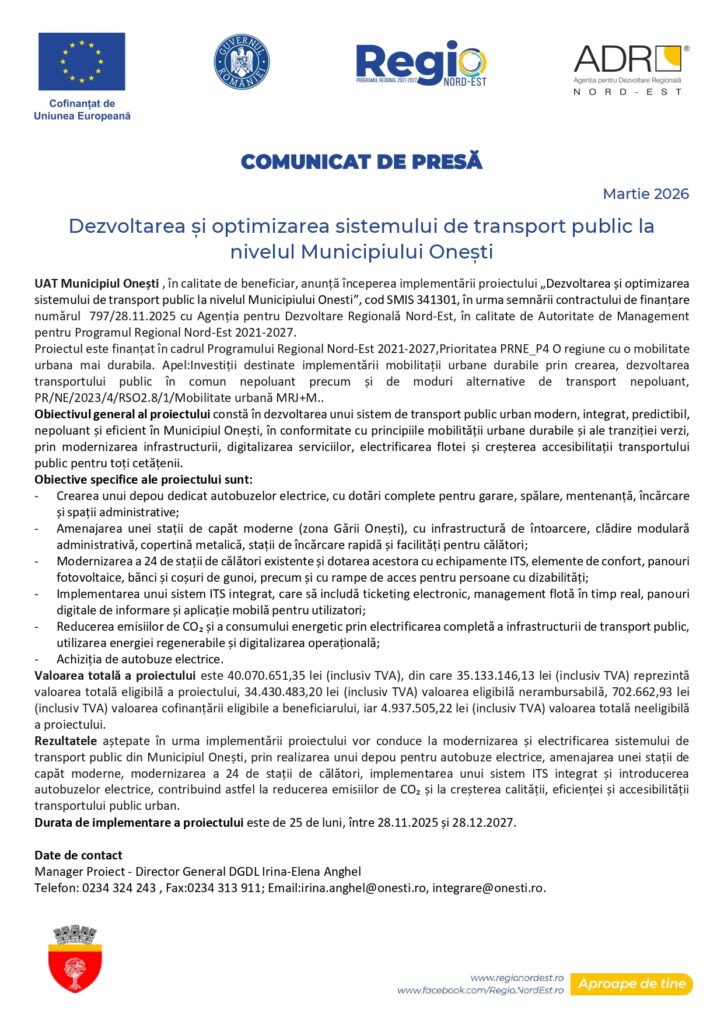 Dezvoltarea și optimizarea sistemului de transport public la nivelul Municipiului OneștiActualitateDezvoltarea și optimizarea sistemului de transport public la nivelul Municipiului OneștiFacebookTwitterPinterestWhatsApp By gzbMarch 17, 2026Citeste si...Prețurile mari la energie, explicate de Bolojan: Decizii greșite și creșteri intenționate, în favoarea băieților deștepți March 17, 2026 Donald Trump avertizează că NATO va avea un „viitor foarte rău” dacă aliații nu ajută SUA în Iran March 17, 2026 Bombardierele SUA atacă masiv Iran de la o bază din Marea Britanie. Avioanele-cisternă, în Bulgaria March 17, 2026 FacebookTwitterPinterestWhatsApp Etichete:Prețurile mari la energie, explicate de Bolojan: Decizii greșite și creșteri intenționate, în favoarea băieților deștepți March 17, 2026 Donald Trump avertizează că NATO va avea un „viitor foarte rău” dacă aliații nu ajută SUA în Iran March 17, 2026 Bombardierele SUA atacă masiv Iran de la o bază din Marea Britanie. Avioanele-cisternă, în Bulgaria March 17, 2026 Câte rachete balistice poate doborî România și SUA dacă Iran va ataca baza Mihail Kogălniceanu March 17, 2026 Prognoza meteo, 16 martie. Săptămâna începe cu temperaturi ușor mai scăzute față de cele înregistrate în weekend March 17, 2026 Meteo. Cum va fi vremea în penultima săptămână de martie? Prognoza pe regiuni March 17, 2026 Cele mai populare articolePrețurile mari la energie, explicate de Bolojan: Decizii greșite și creșteri intenționate, în favoarea băieților deștepțiDonald Trump avertizează că NATO va avea un „viitor foarte rău” dacă aliații nu ajută SUA în IranBombardierele SUA atacă masiv Iran de la o bază din Marea Britanie. Avioanele-cisternă, în BulgariaCâte rachete balistice poate doborî România și SUA dacă Iran va ataca baza Mihail KogălniceanuPrognoza meteo, 16 martie. Săptămâna începe cu temperaturi ușor mai scăzute față de cele înregistrate în weekendMeteo. Cum va fi vremea în penultima săptămână de martie? Prognoza pe regiuniPrimele avioane cisternă americane au ajuns în România. Baza de operare: Mihail KogălniceanuNissan, Uber și Wayve dezvoltă împreună robotaxiuri autonome