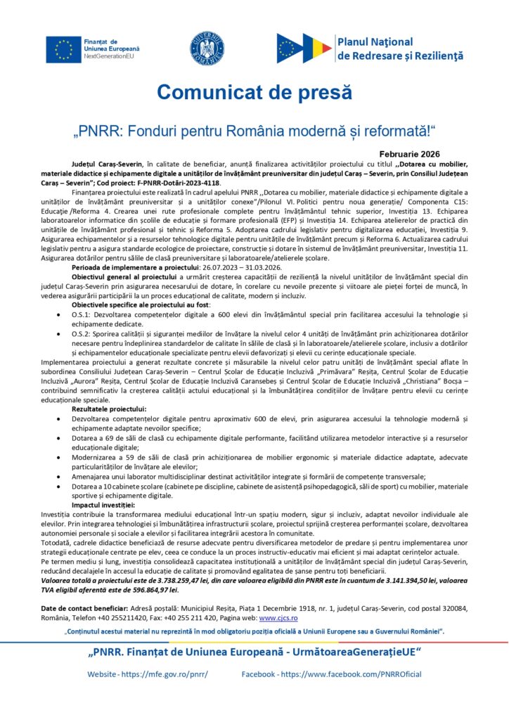 Dotarea cu mobilier, materiale didactice și echipamente digitale a unităților de învățământ preuniversitar din județul Caraș – Severin, prin Consiliul Județean Caraș – Severin