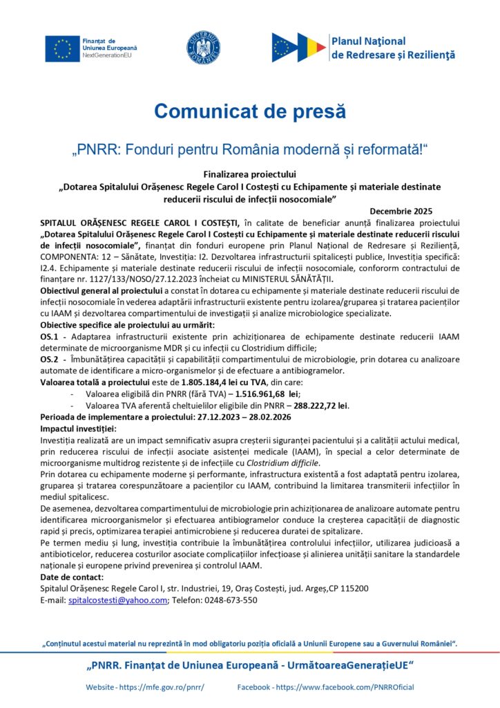 Actualitate„Dotarea Spitalului Orășenesc Regele Carol I Costești cu Echipamente și materiale destinate reducerii riscului de infecții nosocomiale”
