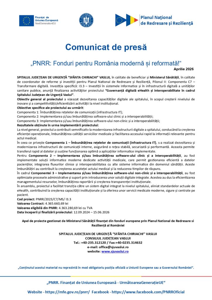 Finalizarea activităţilor proiectului “Guvernanță digitală eHealth și interoperabilitate în cadrul Spitalului Județean de Urgență Vaslui”.
