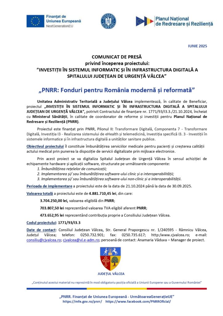 INVESTIȚII ÎN SISTEMUL INFORMATIC ȘI ÎN INFRASTRUCTURA DIGITALĂ A SPITALULUI JUDEȚEAN DE URGENȚĂ VÂLCEA
