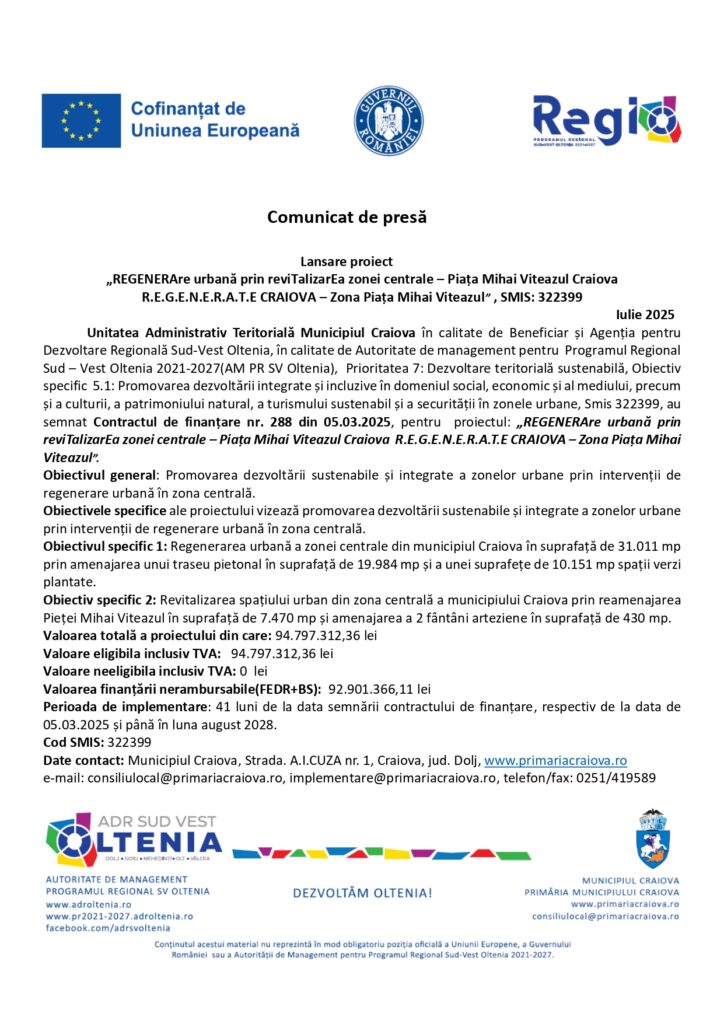 Lansare proiect „REGENERAre urbană prin reviTalizarEa zonei centrale – Piața Mihai Viteazul Craiova R.E.G.E.N.E.R.A.T.E CRAIOVA – Zona Piața Mihai Viteazul”