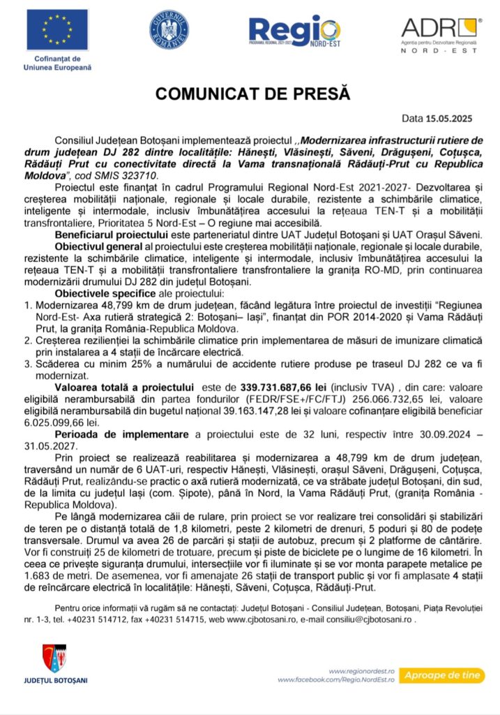 Actualitate,,Modernizarea infrastructurii rutiere de drum județean DJ 282 dintre localitățile: Hănești, Vlăsinești, Săveni, Drăgușeni, Coțușca, Rădăuți Prut cu conectivitate directă la Vama transnațională Rădăuți-Prut cu Republica Moldova”