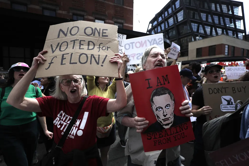 La New York, câteva sute de protestatari anti-Tesla s-au adunat sâmbătă în fața showroom-ului companiei din Manhattan. Sophie Shepherd, în vârstă de 23 de ani, organizatoare din partea grupului Planet Over Profit, a explicat că manifestația nu vizează protestul împotriva mașinilor electrice
