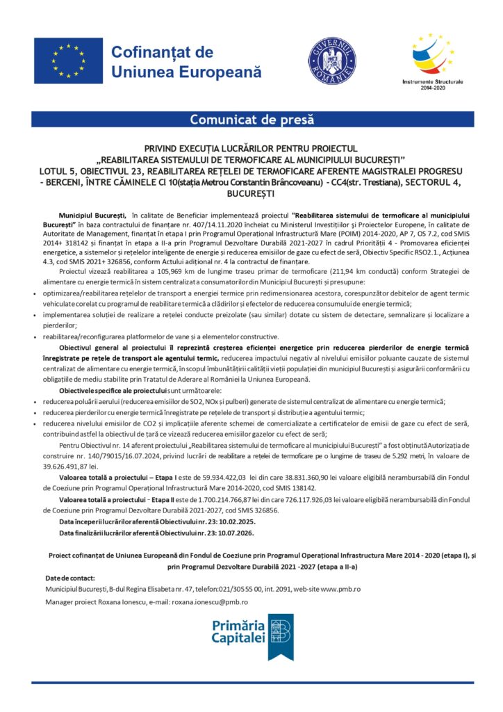 REABILITAREA SISTEMULUI DE TERMOFICARE AL MUNICIPIULUI BUCUREȘTI” LOTUL 5, OBIECTIVUL 23, REABILITAREA REȚELEI DE TERMOFICARE AFERENTE MAGISTRALEI PROGRESU – BERCENI, ÎNTRE CĂMINELE Cl 10(stația Metrou Constantin Brâncoveanu) – CC4(str. Trestiana), SECTORUL 4, BUCUREȘTI