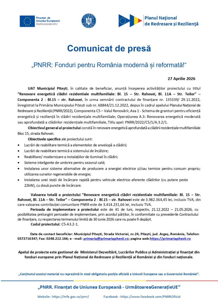 ActualitateRenovare energetică clădiri rezidentiale multifamiliale: Bl. 15 – Str. Rahovei, Bl. 11A – Str. Teilor” – Componenta 2 – Bl.15 – str. Rahovei